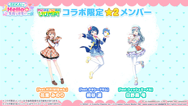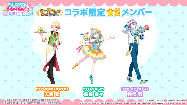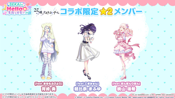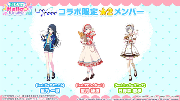 「SEKAIでHello(ハート)素敵な出会いガチャ」では、「ライブ衣装」と「限定アバターアクセサリ」付きの「コラボ限定★4メンバー」6人、および「コラボ限定★2メンバー」20人が新登場いたします。