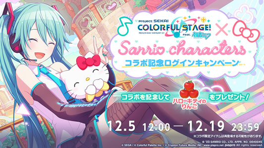株式会社セガ(本社:東京都品川区、代表取締役社長COO:杉野行雄)と株式会社Colorful Palette(本社:東京都渋谷区、代表取締役社長:近藤裕一郎)は、iOS/Android向けリズム&アドベンチャー『プロジェクトセカイ カラフルステージ! feat. 初音ミク(以下、プロジェクトセカイ)』について、2023年12月5日(火)よりプロジェクトセカイ×サンリオキャラクターズコラボ記念「SEKAIでHello(ハート)素敵な出会いガチャ」、コラボ記念ログインキャンペーンが開催中です。