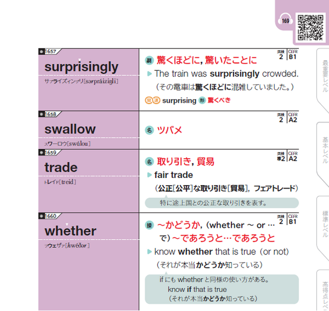 『英単語』 は改訂にあたり、収録語数を1,850から2,000に増やし、最新の高校入試により対応できるようになりました。また、『英単語』『英熟語』では、右上にある二次元コードをスマートフォンなどで読み取ることで、手軽に音声を聞くことができます。これでリスニング対策もばっちりです。