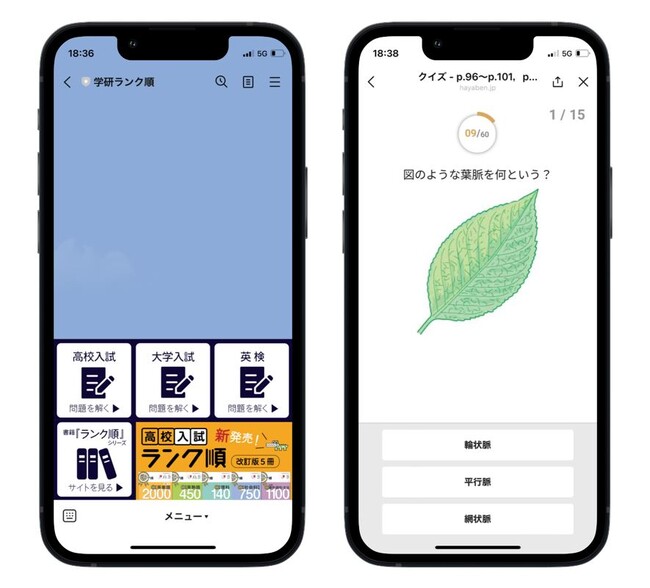 ウェブアプリは、スマートフォンなどでLINEアプリを開き、「学研ランク順」を友だち追加することで利用できます。ゲーム感覚で繰り返し解いていくうちに、単語や用語がいつの間にか頭に残ります。