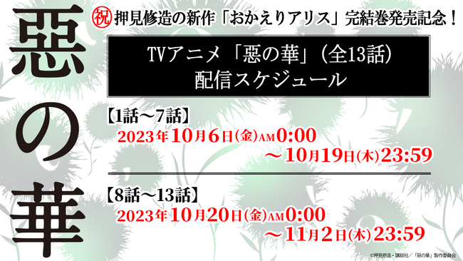 本日10月6日、「惡の華」などで知られる押見修造先生の「おかえりアリス」最新第7巻が発売され、堂々の完結を迎えました。これを記念して、講談社が運営するYouTubeチャンネル「フル☆アニメTV」にて、TVアニメ「惡の華」全13話を期間限定で順次無料公開いたします。【第1話~第7話】を本日10月6日から10月19日まで、【第8話~第13話】を10月20日から11月2日までの期間限定配信となりますので、「おかえりアリス」と一緒にぜひお楽しみください!