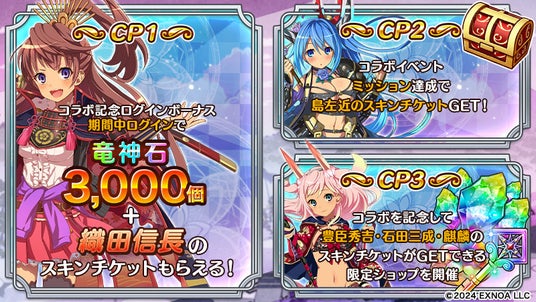 『戦国プロヴィデンス』とのコラボを記念したログインボーナスを開催中!ガチャやスタミナ回復などに使える「竜神石」が最大3,000個にくわえ、コラボ限定の「織田信長のスキンチケット」が入手可能です。毎日ログインして「竜神石」とコラボ限定スキンチケットを手に入れよう!