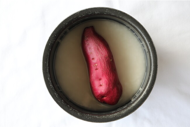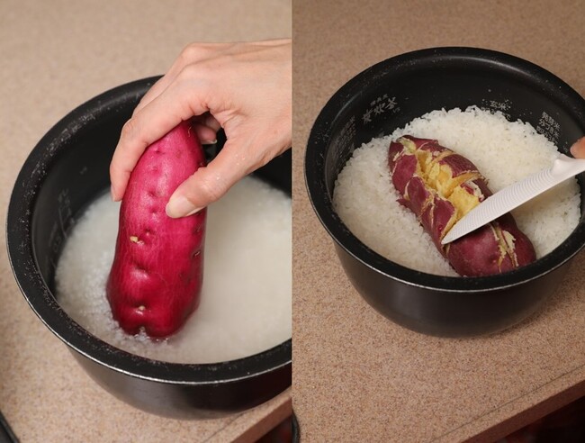 極力洗い物は増やしたくない。だから、まずは代わりに使えるものはないか、まわりを見渡してみます。たとえば「さつまいもごはん」を作るとき。炊飯器に米、水、酒、塩を入れたあと、軽く混ぜたい。でも菜箸などを出すのは面倒なので、具にするさつまいもで混ぜちゃえ!