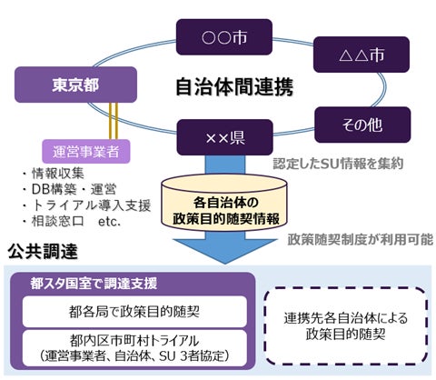 優れた製品・サービスを自治法施行規則に基づく製品として認定し、入札によることなく調達が可能となる政策目的随意契約制度(※)を最大限活用し、スタートアップの製品サービスの公共調達促進を図ります。自治体間で相互に連携・協力しながら、スタートアップの情報を共有・カタログ化し、他団体で活用可能な仕組みを構築します。事業実施に当たっては、民間運営事業者と東京都が連携・協力し事業を推進します。