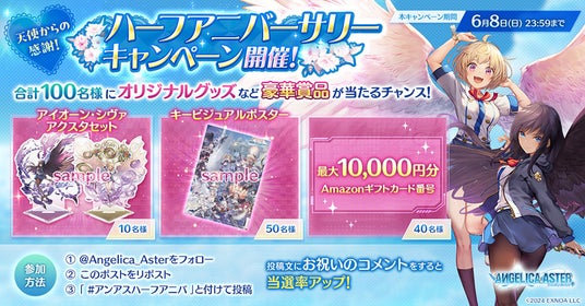 公式X(https://x.com/Angelica_Aster)をフォロー&RPして「#アンアスハーフアニバ」をつけて投稿いただくことで
