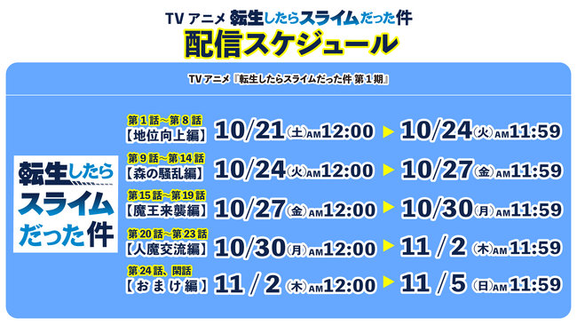 アニメ「転生したらスライムだった件」(1期全25話)配信スケジュール