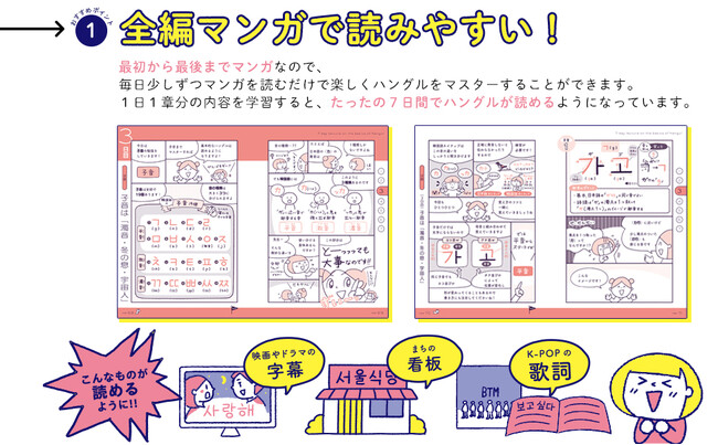本書はタイトル通り、ハングルを全編マンガ・たった7日で身につけるというコンセプトになっています。