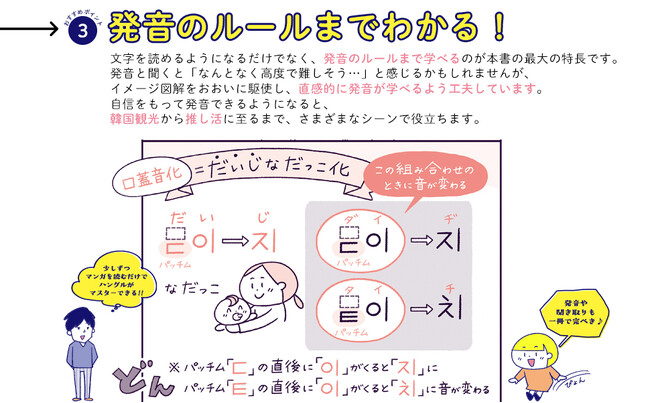 また、本書の最大の特徴は「発音のルール」まで身につけられる点です。ここでもイメージ図解やゴロを駆使し、韓国語学習者にとっての高いハードルになる「発音変化」を難なく攻略できるように工夫しています。