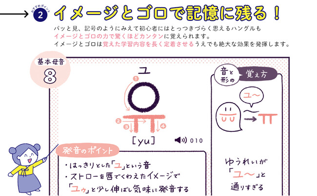 この本のすごいのは、たんに「マンガだから読みやすい」というだけではありません。「記号」のように見えて覚えづらいハングルを鮮明に脳内に刻み込んでくれる「イメージ」と「ゴロ」が随所に登場するのです。この本で読むことで、はじめ記号にしか見えなかったハングルがたちどころに「なじみあるもの」に変わります。
