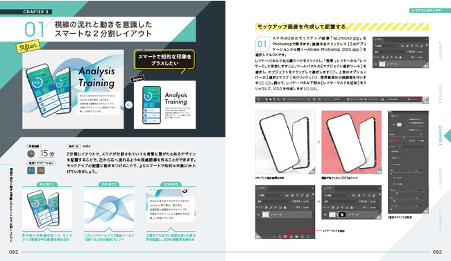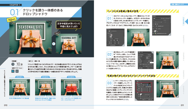 本書は、10~15分程度のひと手間をかけて、パッとしないバナーをブラッシュアップするデザインテクニックを紹介しています。バナーの狭いスペースのなかで有効なデザインを、Before→Afterの流れで解説。デザインのアイデアだけでなく、完成に至る工程もステップ・バイ・ステップ形式で指南しているので、実際にどう手を動かせばよいかがわかります。バナーには“多様なサイズに展開される”という特徴もあるので、縦長と横長のサイズバリエーションも掲載。バナーデータはPSD形式またはAI形式でダウンロードできます。