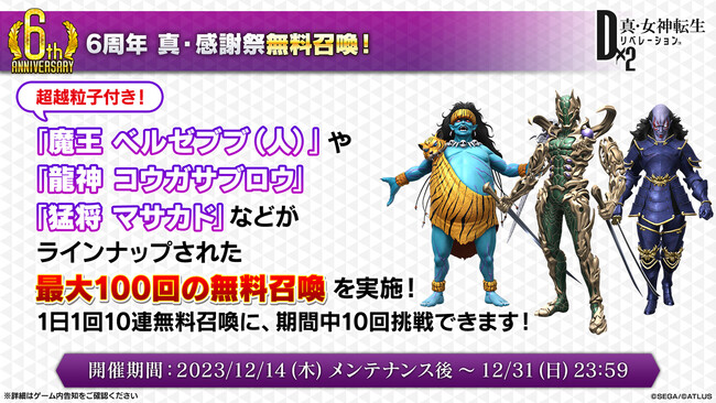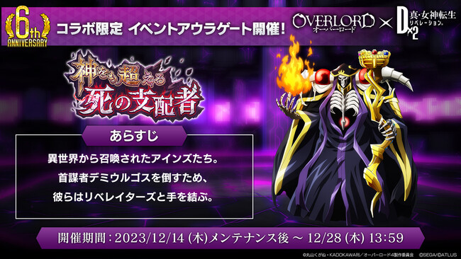 株式会社セガは、『真・女神転生』のスマートフォン向けタイトル、『D×2(ディーツー) 真・女神転生リベレーション(以下、『D2メガテン』)』にて、『オーバーロード』とのコラボレーションイベントを、本日2023年12月14日(木)より開催します。