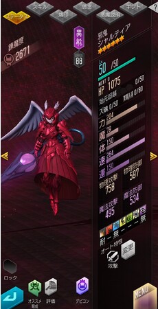 自身が打撃型・魔法型攻撃と割合ダメージを受けた時と、悪魔を倒したとき、連動効果「1ターンの間、敵全体の防御力を20%減少させ、現在HPがもっとも低い敵1体に防壁貫通を得た火炎または破魔属性の打撃型ダメージを威力180で与え、そのダメージの50%分、自身を回復する。(1ターン中2回まで)」