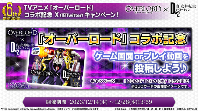 期間中、D2メガテン公式Xアカウント(https://twitter.com/d2megaten)をフォローのうえ、ハッシュタグ「#D2メガテン」「#D2メガテンオーバーロードコラボキャンペーン」をつけて、オーバーロードコラボイベントのゲームスクリーンショット画面、またはプレイ動画を投稿した方の中から、抽選で合計30名様に「オーバーロードコラボデザインQUOカード(5,000円分)」が当たります。ぜひご参加ください!