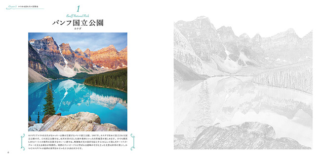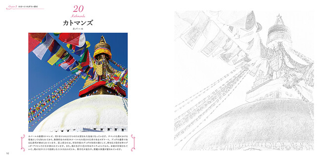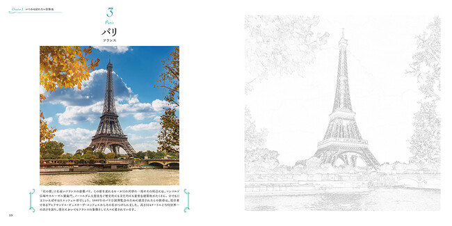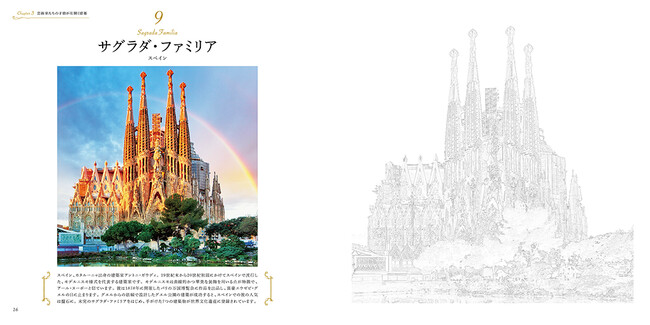 世界遺産24カ所の塗り絵を収録。線画ガイドに沿って輪郭を描いて、彩色すると、旅先でスケッチしたような一枚が完成します。左ページの見本写真を参考にしながら、自由に彩色しましょう。完成した塗り絵は切り取って飾るのもオススメです。