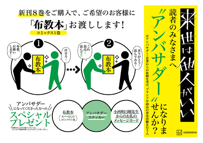 アンバサダーとは、[企業からの依頼を受け、ブランドや商品の普及活動を行う人々]のことを指し、本キャンペーンでは、ご友人やご家族などに『来世は他人がいい』を布教してくださるアンバサダーの皆様を募集いたします。