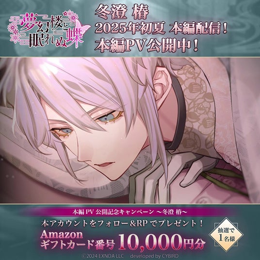 DMM GAMESを運営する合同会社EXNOA(本社:東京都港区、CEO:村中 悠介、URL:https://games.dmm.com/)は、オトナの女性向け恋愛ゲーム「夢幻楼と眠れぬ蝶」にて、冬澄 椿(CV:あさぎ夕)の特設ページをゲーム内にて公開いたしました。椿本編PVが公開されたこともお知らせいたします。