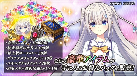 さらに「『D.C.5 PH』『D.C.5 SH』コラボ記念 桜来瑞花確定パック」を購入すると「『D.C.5 PH』『D.C.5 SH』コラボ記念 桜来瑞花強化パック」が購入可能になります!こちらの商品では「桜来瑞花の欠片」や有償ジュエルに加えて、「プラチナガチャチケット」や「SSRスキル選択宝箱」、「特上級ポーション」など様々な豪華アイテムをお得に獲得することができます!