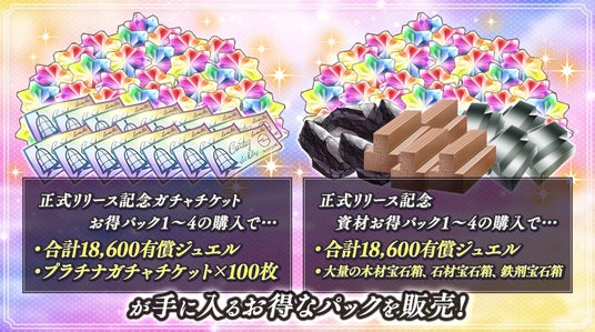 正式リリースを記念して「正式リリース記念ガチャチケットお得パック1~4」が登場。このパックでは有償ジュエルの他、プラチナガチャチケットが合計で100枚お得に獲得することができます!