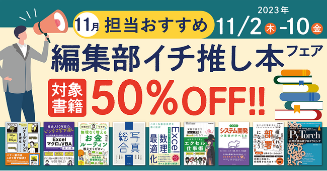 インプレスグループでIT関連メディア事業を展開する株式会社インプレス(本社:東京都千代田区、代表取締役社長:高橋隆志)は、対象の電子書籍が50%オフで購入できる「担当おすすめ!編集部イチ推し本フェア 2023年11月」を2023年11月2日(木)から11月10日(金)まで実施いたします。