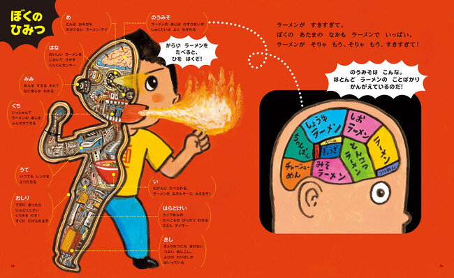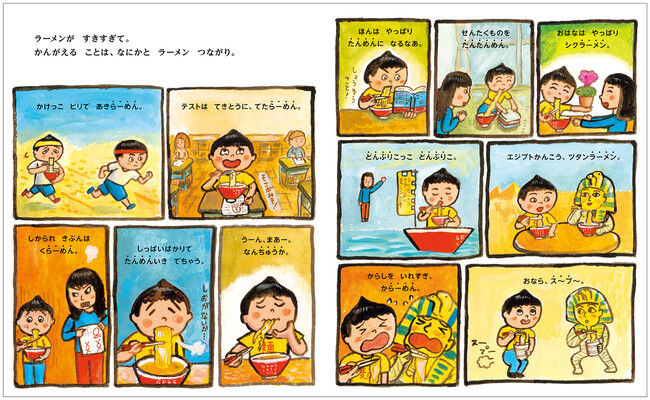 ラーメンマンの心までも動かした絵本『ラーメンがすきすぎて』。本書が生まれたきっかけは、なんと言っても作者・サトシンさんに秘密があります。サトシンさん、じつは言わずと知れた大のラーメン好き。1年の半分以上を全国各地の講演会にまわる際、各地でご当地ラーメンを食べるのが好きだそう。ユーモア絵本を作らないかとGakkenの担当編集者から声をかけられたとき、すぐに浮かんだのが『ラーメンがすきすぎて』でした。が、当時子どもの好きな食べものランキングでお寿司が1位だったため、編集部から同時にプレゼンしていた『おすしがすきすぎて』から出しませんかと提案され、『おすしがすきすぎて』が2021年に発刊されました。そして満を持して第2弾、『ラーメンがすきすぎて』がついに刊行の運びとなりました。
