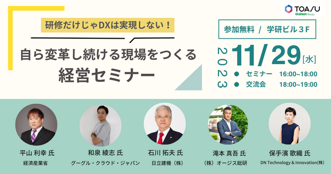 株式会社 学研ホールディングス(東京・品川/代表取締役社長:宮原博昭)のグループ会社、株式会社TOASU(東京・品川/代表取締役社長:宮田 晃)は、2023年11月29日(水)にDX推進に取り組む経営者の方々へ向けたセミナーを開催いたします。
