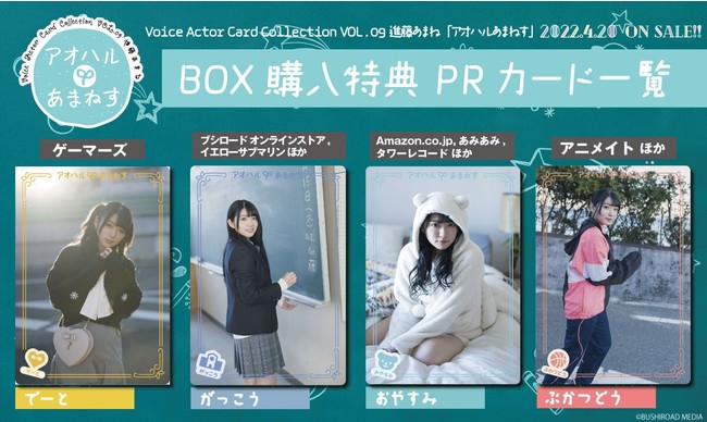 株式会社ブシロード(本社:東京都中野区、代表取締役社長:橋本義賢、以下ブシロード)のグループ会社にあたる株式会社ブシロードメディア(本社:東京都中野区、代表取締役社長:成田耕祐)は、Voice Actor Card Collection(以下:ボイコレ) VOL.09 進藤あまね『アオハルあまねす』を、ご本人の誕生日である本日4月20日(水)に発売することをご案内致します。プレスリリース限定でご本人からのメッセージもお届け致します。