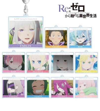 エミリア、スバル、レム、ラム、ベアトリス、エキドナ、ミネルヴァ、ダフネ、テュフォン、セクメト、カーミラをアクリルキーホルダーに仕上げました。