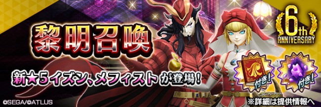 株式会社セガは、『真・女神転生』のスマートフォン向けタイトル、『D×2(ディーツー) 真・女神転生リベレーション)』にて、2024年1月1日(月)より、新★5悪魔「魔王 メフィスト」と「女神 イズン」が登場する期間限定の召喚を開催します。