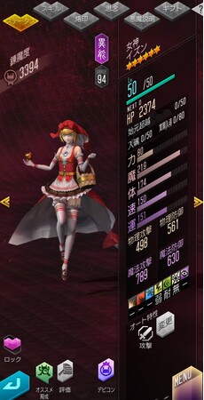 1ターン目開始時と自身を含む味方が悪魔を倒したとき、連動効果が発動「現在HPが最も低い敵1体と最も高い敵1体ずつに減退1カウントを与え、1ターンの間、呪殺属性相性を3段階低下させる。」