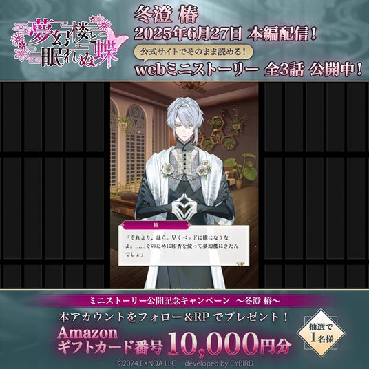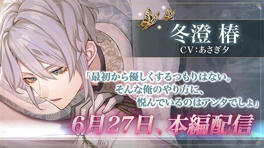 DMM GAMESを運営する合同会社EXNOA(本社:東京都港区、CEO:村中 悠介、URL:https://games.dmm.com/)は、Romanteen18シリーズの第1弾・オトナの女性向け恋愛ゲーム「夢幻楼と眠れぬ蝶」にて、冬澄 椿(CV:あさぎ夕)の本編の配信日が6月27日(金)に決定したことをお知らせいたします。またWebミニストーリー最終話を公開し、公開を記念したXキャンペーンの開催もお知らせいたします。