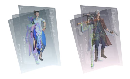 プロジェクションマッピング(春麗・ダンテ)の展示を、角度を変えると画像が3パターンに切り変わるレンチキュラーのポストカードで再現。