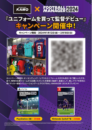 サッカーショップKAMOの店頭及びオンラインサイトにて、オーセンティックもしくはレプリカのユニフォームをご購入いただき、応募された方の中から抽選で合計50名に『Football Manager 2024』パッケージ版をプレゼント。店頭POP、もしくは店舗で配布されるチラシ内のQRコードよりアクセスできる専用サイトから応募可能です。