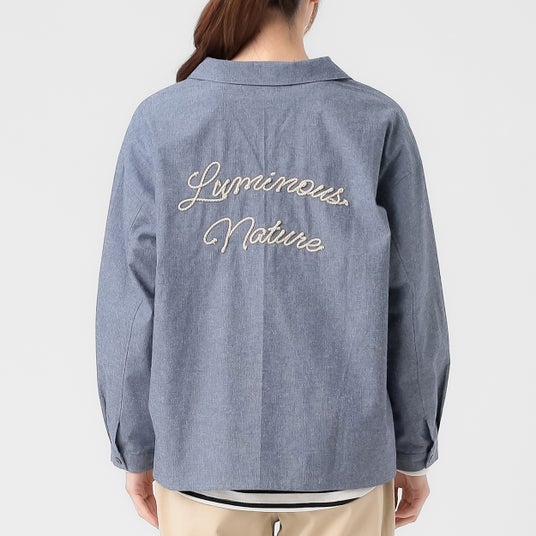 背中の立体感あるコード刺繍がポイントです。前開きデザインで、羽織としても着られる、着回し できるシャツジャケットです。刺繍の図柄や生地の色は皆で意見を出し合い決定しました。