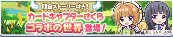内容:期間限定のコラボ専用ワールド「カードキャプターさくら コラボの世界」を開催します。「カードキャプターさくら コラボの世界」は、「カードキャプターさくら」のコラボキャラクターたちが活躍する復刻限定ストーリー「さくらのぷよっと大冒険」が読める期間限定のコラボ専用ワールドです。