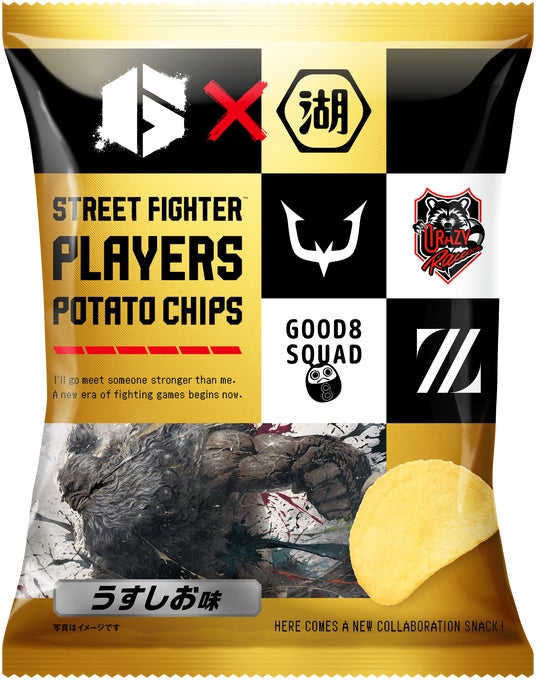 「ストリートファイタープレイヤーチップス」は定番の「うすしお」味! 各eスポーツチームのロゴをパッケージにあしらったスタイリッシュなデザインとなっている。
