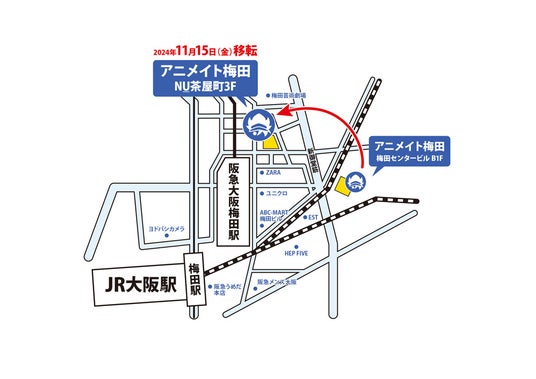 「アニメイト」は全国47都道府県に123店舗を展開するアニメ・コミック・ゲームの専門店で、アニメイト梅田は2011年にオープン、以来たくさんのお客様にご利用いただいている店舗となります。「アニメイト梅田」は阪急大阪梅田駅・茶屋町口より徒歩1分の最新ファッション・人気の雑貨やグルメまで揃った商業施設「NU茶屋町」の3階に移転し、ワンフロア全部が「アニメイト」になります。2024年11月15日に一部区画が先行オープンし、2025年春にグランドオープンいたします。
