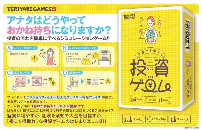 株式会社ブシロード(本社:東京都中野区、代表取締役社長:橋本義賢、以下ブシロード)のグループ会社にあたる株式会社ブシロードメディア(本社:東京都中野区、代表取締役社長:成田耕祐)は、本日4月28日(木)に発売となるカジュアルボードゲームブランド「TERIYAKI GAMES」の第4弾『7歳から学べる投資ゲーム』(企画:しんどうこうすけ)についてご案内致します。本商品は、通販ショップ、ボードゲーム専門店、玩具・雑貨売り場ほかにて販売予定です。