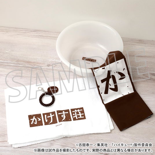 作中に登場したかけす荘とホテルまたたびをイメージした「お風呂セット」が登場!風呂桶・手ぬぐい・ロッカーキー風アクリルキーホルダー・フェイスタオルの豪華4点セット!お風呂グッズとしてはもちろん、お手持ちのグッズと一緒に飾ってもおたのしみいただけます。