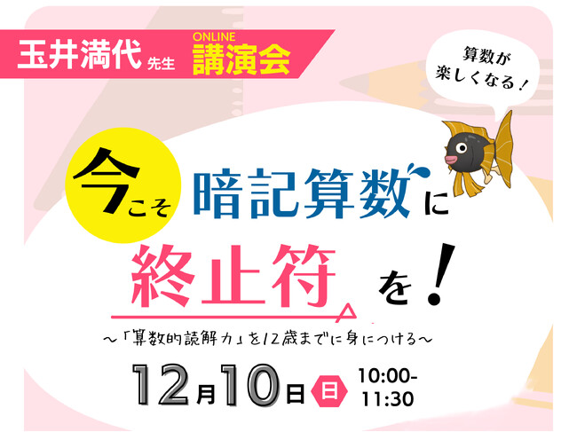 「玉井式」の生みの親、玉井満代先生に語りつくしていただくオンラインライブ講演会! 「算数的読解力」を12歳までに身につける方法とは? 小学生の保護者、必見です!