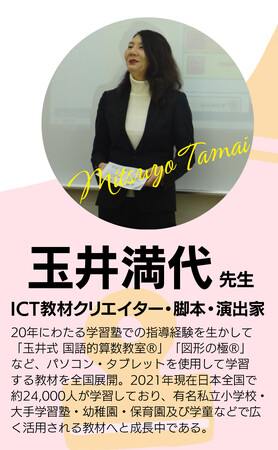 20年にわたる学習塾での指導経験を活かして「玉井式 国語的算数教室(R)」「図形の極(R)」など、パソコン・タブレットを使用して学習する教材を全国展開。2021年現在、日本全国で約24000人が学習しており、有名私立小学校・大手学習塾・幼稚園・保育園及び学童などで広く活用される教材へと成長中である。