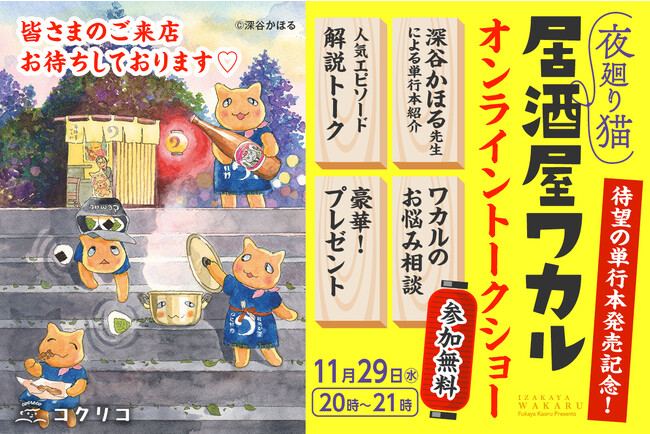 累計65万部突破の大人気漫画「夜廻り猫」(作・深谷かおる)のスピンオフとして、WEBサイト「コクリコ」で連載していた「夜廻り猫 居酒屋ワカル」。毎週最新話更新のたびに「ワカルちゃんかわいくて大好き!」「心が疲れたときに癒やされる」と大きな反響を呼んでいた「居酒屋ワカル」、11月22日ついに単行本が発売されます!