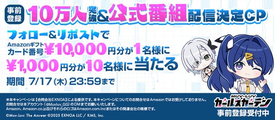 事前登録者数10万人突破を記念&公式番組配信決定を記念して、公式X(https://x.com/Muvluv_GG)のフォロー&キャンペーン対象ポストのリポストをすることで、抽選で1名様にAmazonギフトカード番号10,000円分・10名様にAmazonギフトカード番号1,000円分をプレゼントいたします。是非ふるってご参加ください!