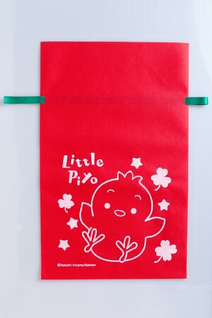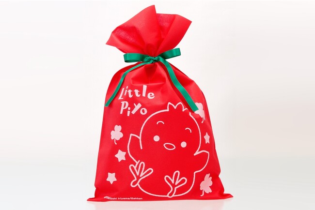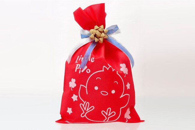 ギフトセットをすべて入れるラッピング袋もオリジナルでご用意しました。赤い袋に大きなぴよちゃんがかわいい! リボンはグリーンなので、クリスマスプレゼントにぴったりです。
