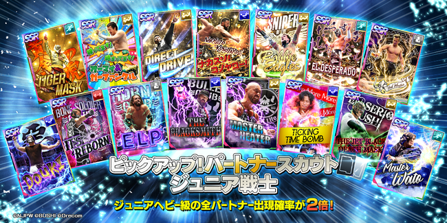 本パートナースカウトでは、対象のジュニアヘビー級選手のパートナーがピックアップ対象として排出確率が通常の2倍となるピックアップパートナースカウトとなります。