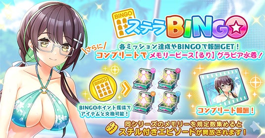 7月23日より新イベント「ステラBINGO」を開始いたしました! このイベントでは、計15枚のパネルに設定された各ミッションをクリアすることで縦横のビンゴを達成していきます。各ミッションのクリア時やビンゴ達成時にそれぞれ報酬があることはもちろん、全パネルのミッションをクリアすることで「メモリーピース【るり】グラビア水着」がゲットできます! このメモリーピースは、橙美女学院アイドル部のメモリーイラストを解放するために必要なアイテムなので、ミッションコンプリートを目指しましょう!