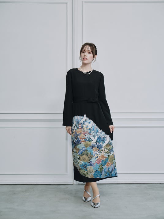 すっきりとしたクルーネックとストレートラインに、袖口のスリットとフレアがさりげない動きを添えるロングドレスです。鶴の柄は「長寿」と「夫婦円満」を象徴する吉祥の意匠になり、青を基調とした柄が黒地に映えています。付属のサッシュやお手持ちのベルトでウエストにメリハリが生まれ、外せばまっすぐなシルエットで着用できます。