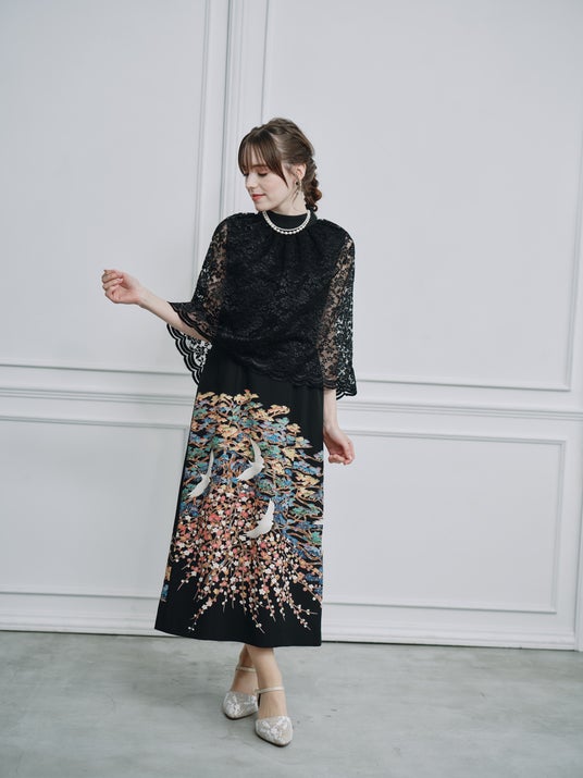 レースのケープが肩から二の腕をやさしく覆い、黒地に咲く梅と舞う鶴の意匠を品よく引き立てるロング丈のストレートドレスです。透け感が軽さを生み重たくならず、首元のケープラインが顔周りをすっきりと見せます。黒留袖に描かれた梅は「まごころ」と「忍耐強さ」を、鶴は「長寿」と「夫婦円満」を象徴する吉祥柄で、黒地の艶に彩り豊かな柄は、写真映えも抜群です。