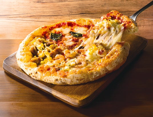 マルゲリータ、具だくさんてりやきチキンとコーン、海の幸シーフード(えび・いか・小柱)、コクとうまみのポテトベーコンの4種のピッツァが入った、4種類の味が1枚で楽しめるピッツァソリデラ人気No.1のピッツァです。