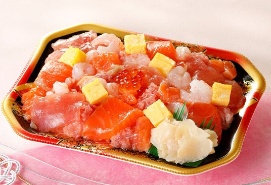 華やかな彩りがひな祭りの食卓を引き立てます。まぐろ、サーモン、甘えびなど人気の海鮮ネタに自慢のオリジナル玉子焼きをトッピング。彩りよく盛り付けた海鮮ネタのちらし寿司です。