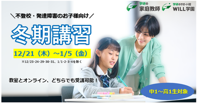 株式会社学研ホールディングス(東京・品川/代表取締役社長:宮原博昭)のグループ会社、株式会社学研エル・スタッフィング(東京・高田馬場/代表取締役社長:伊藤弘雅)は、不登校・発達障害の児童生徒に専門的に対応している「学研WILL学園」や「学研の家庭教師 訪問支援室」の支援ノウハウを活かして不登校・発達障害の生徒にあわせた、基礎から復習をする「不登校・発達障害の生徒向け冬期特別講習会」を開催予定です。